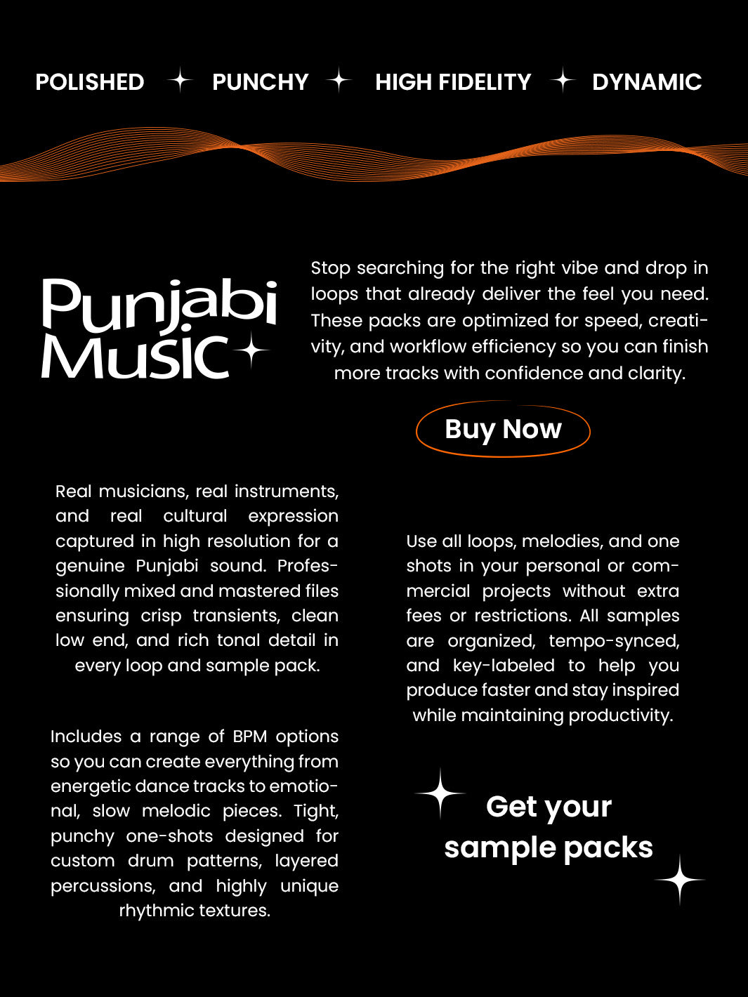 Punjabi Sample Pack is your dedicated source for real Punjabi instrument recordings crafted for modern producers. Every pack is created with live musicians, studio grade equipment, and a deep respect for cultural sound. Whether you are building hip hop, trap, EDM, pop, drill, or authentic Punjabi music, our royalty free loops give you instant inspiration and professional quality without limitations. From traditional tones to contemporary textures, we bring the sound of Punjab straight to your studio.